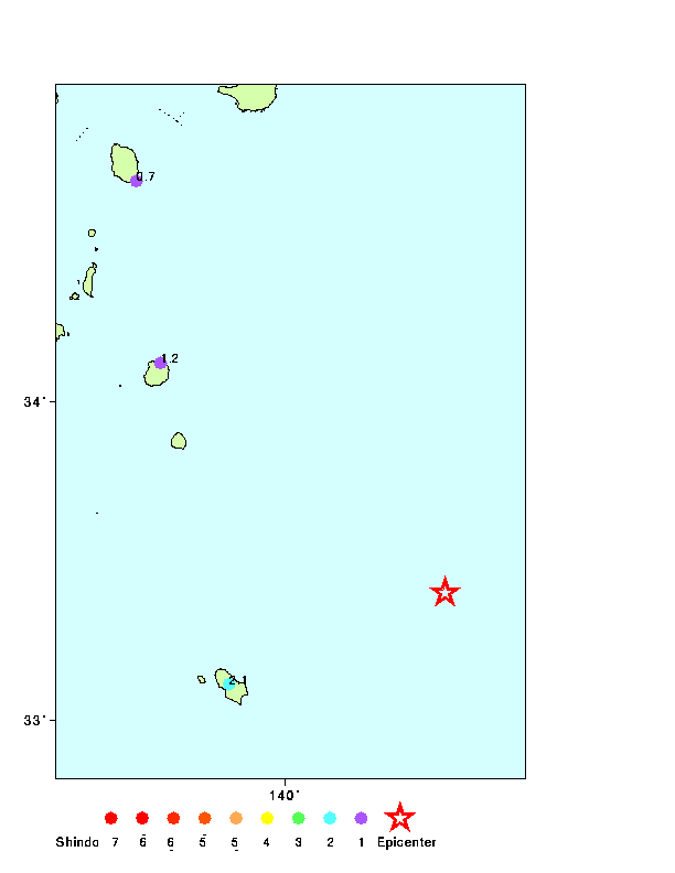 96 年 12 月 07 日 08 時 06 分 緯度 : 33.4 経度 : 140.6 深さ: 50.0 (km) マグニチュード: 4.9