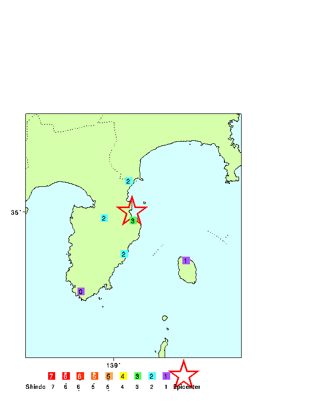 97 年 03 月 06 日 04 時 01 分 緯度 : 35.0 経度 : 139.1 深さ: 10.0 (km) マグニチュード: 3.9