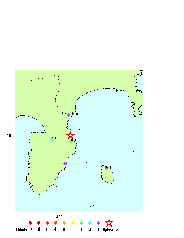 97 年 03 月 10 日 00 時 09 分 緯度 : 35.0 経度 : 139.1 深さ: 10.0 (km) マグニチュード: 3.5