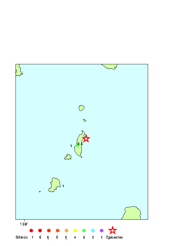 観測点名 観測点コード 経度 緯度 震央距離 計測震度 震度 最大加速度 新島 TKY010 139.2588 34.3741 4.8 3.38 3 124.20 震央距離の単位は km 最大加速度は三成分合成加速度の最大値です(単位はgal)